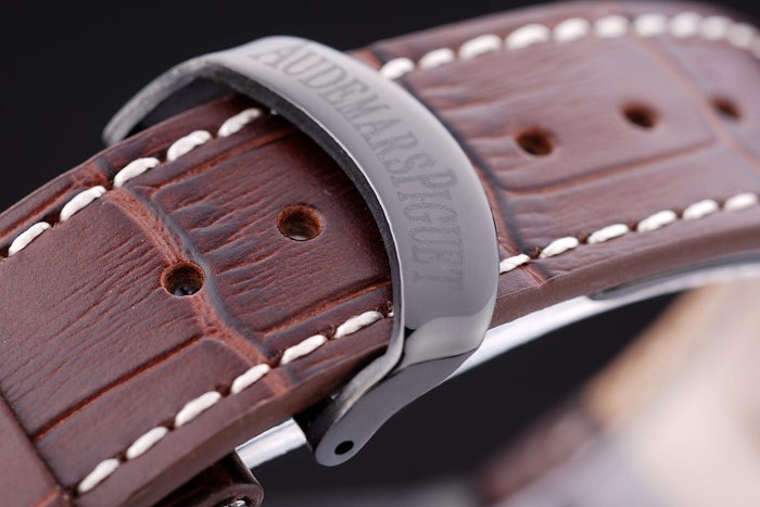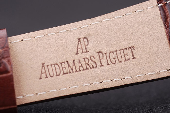 Bracelet en acier inoxydable: bracelet en cuir de crocodile brun foncé avec du blanc surpiq res de fil et de la chaleur en relief Audemars nom Piguet et logo et une Audemars Piguet inscrit ion-plaqué flip-dessus le crochet clasp