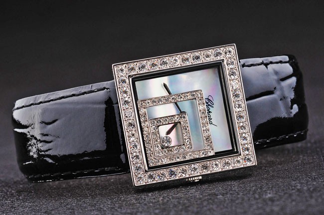Avec des carrés de faux diamants flottant, cette réplique montre Chopard est s r de vous obtenir noticedBack: Poussez en acier inoxydable de retour avec Chopard engravings