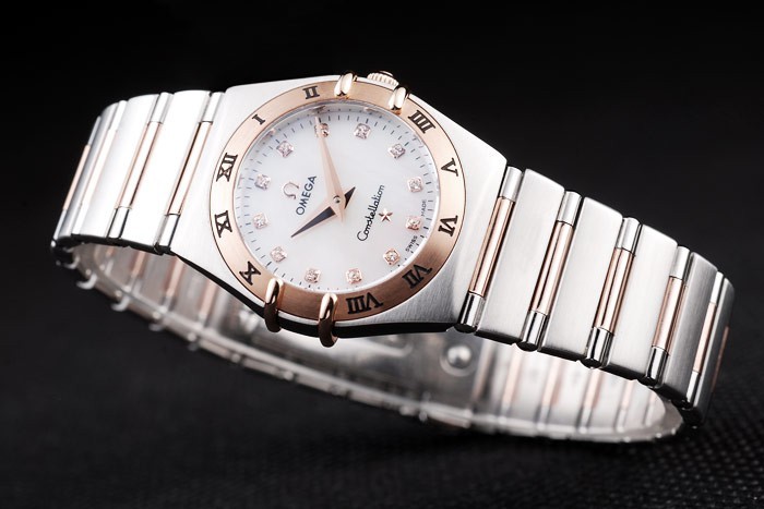 Case: acier inoxydable brossé et or rose maillon de cha ne bracelet avec fermoir caché et Omega logo sur top