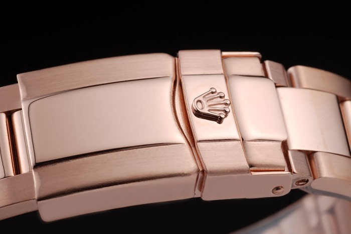 Bracelet: 18k rose en acier inoxydable lien bracelet doré avec Rolex gravée dépliante dans le déploiement fermoir affichant la longueur Rolex logo