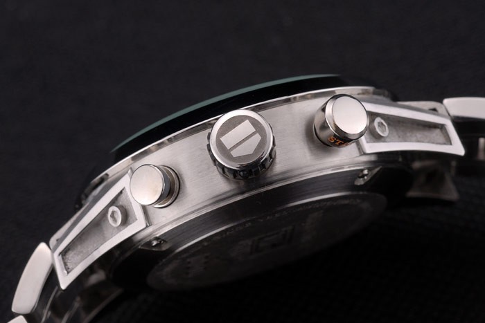 Crown: couronne cutwork en acier inoxydable poli avec Tag Heuer logo et deux rondes couronnes de boutons-poussoirs de chaque c té de it