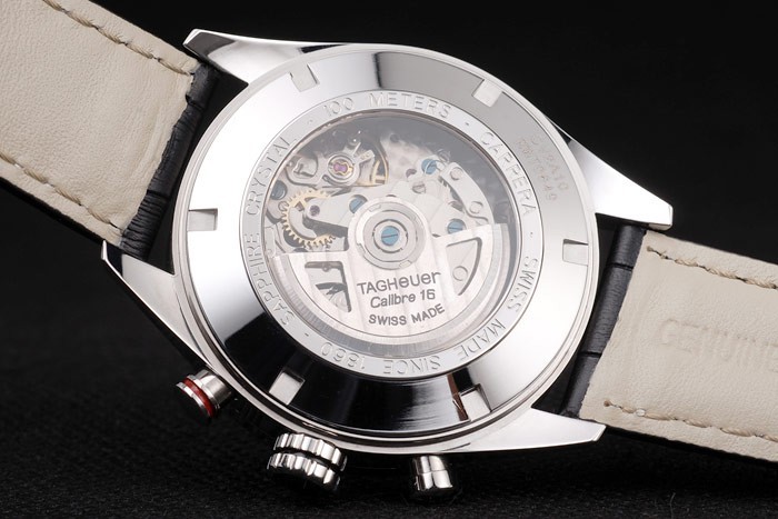 Retour: push en acier inoxydable dans le dos avec la mécanique révélant centre transparent et Tag Heuer engravings