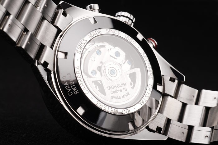 Retour: push en acier inoxydable dans le dos avec la mécanique révélant centre transparent et Tag Heuer engravings